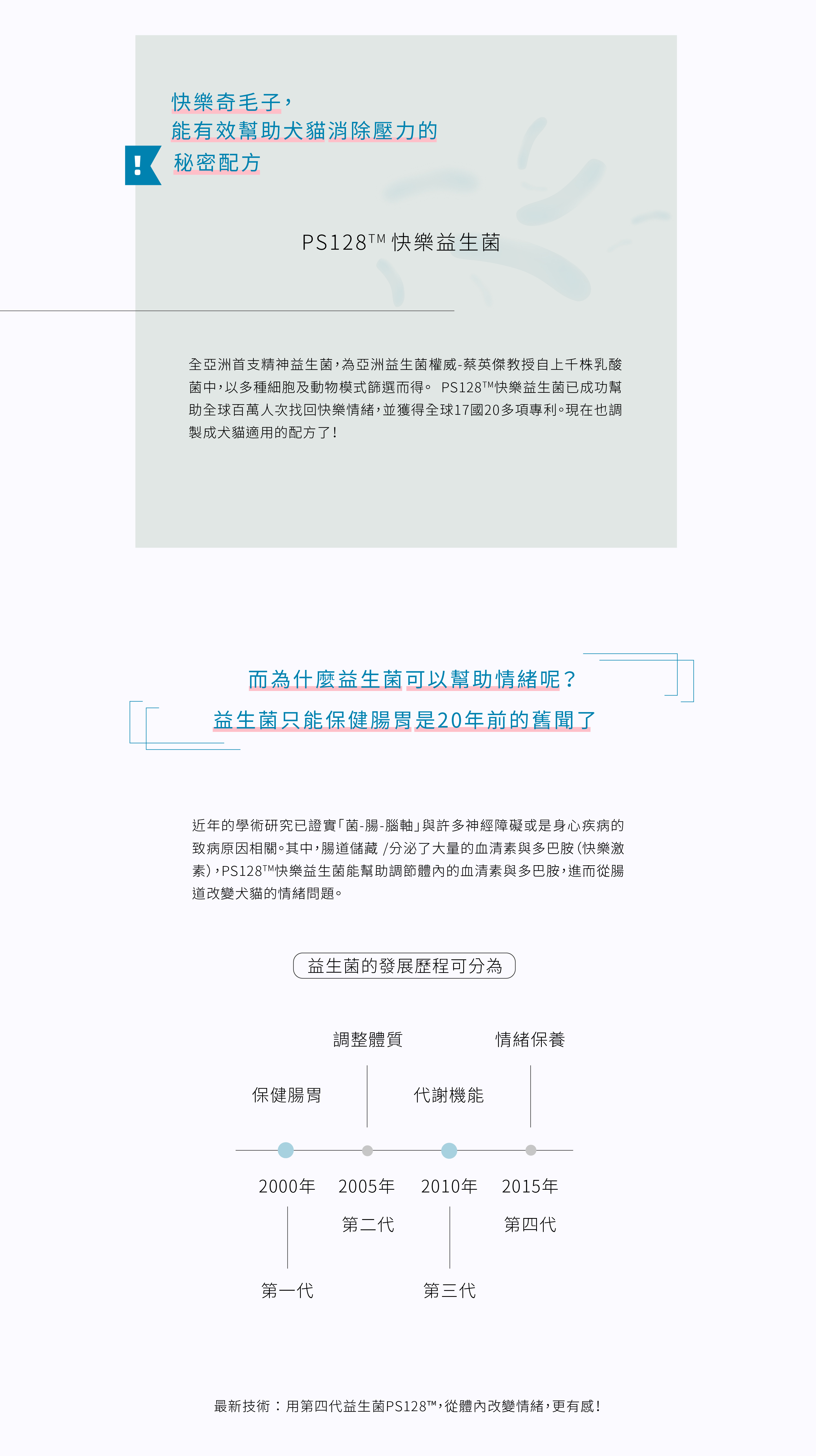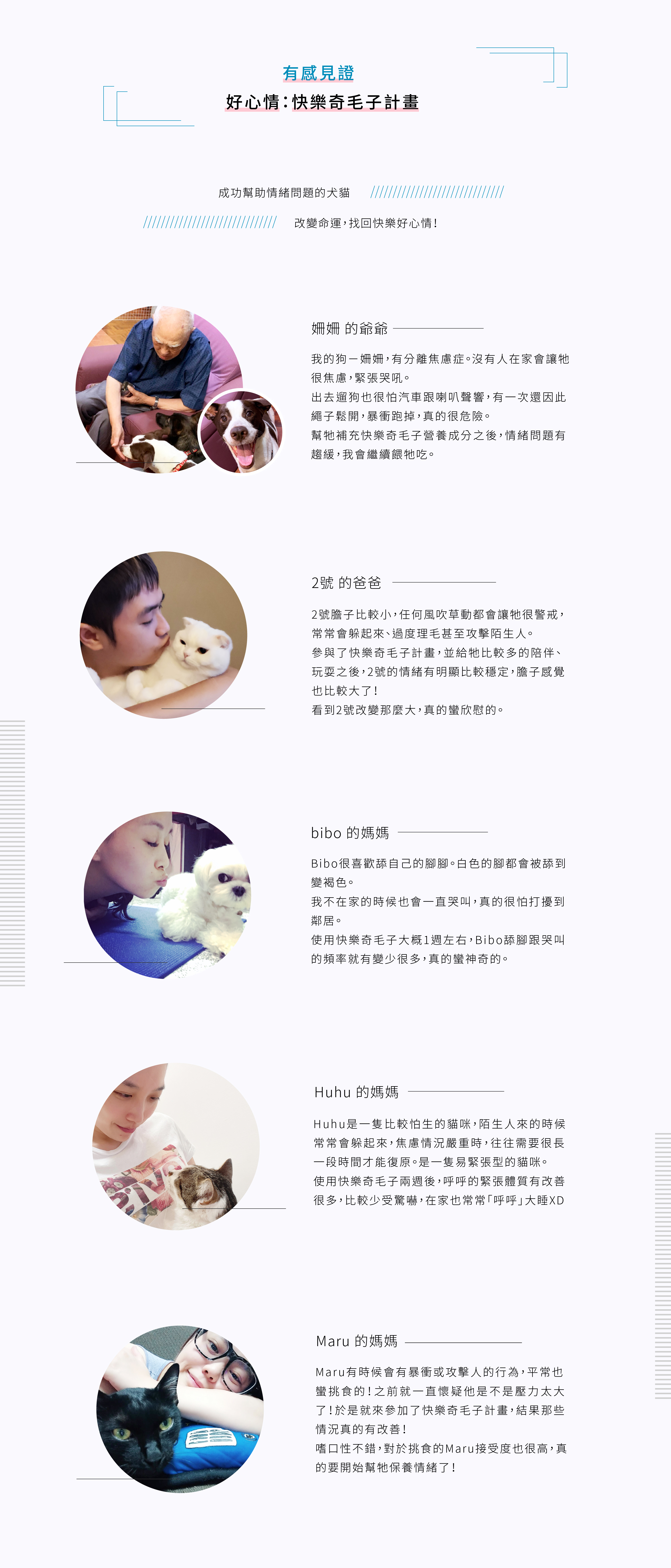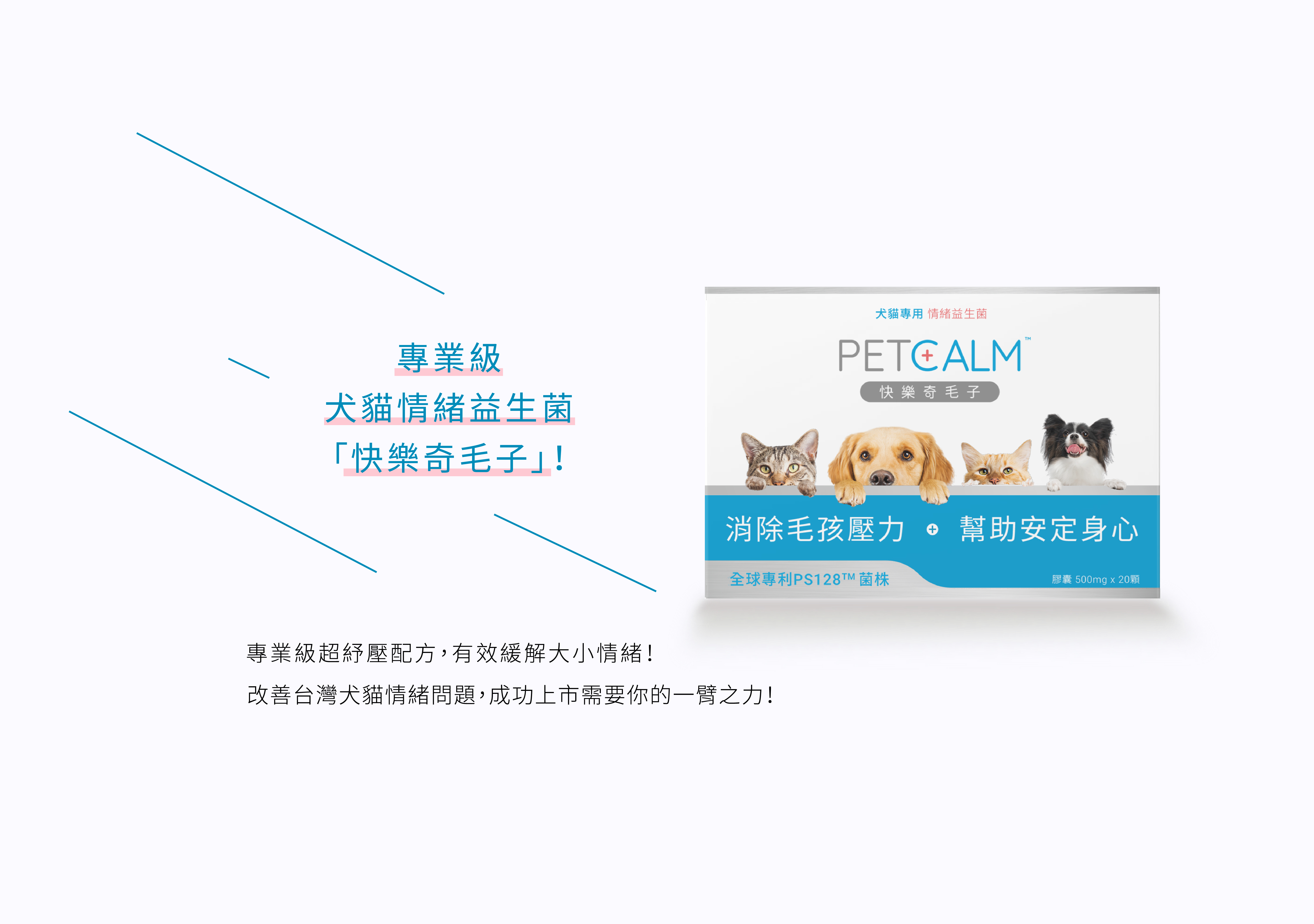 本計畫提倡並希望改變對台灣犬貓行為與情緒的重視,並與動物行為獸醫師、寵物專家長期合作研究,招募大量參與計畫的志願犬貓與主人,3年間效果與嗜口性不斷改良下,終於以PS128™快樂益生菌為基底,調配出適合犬貓的最佳配方: