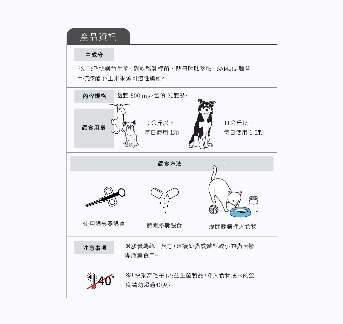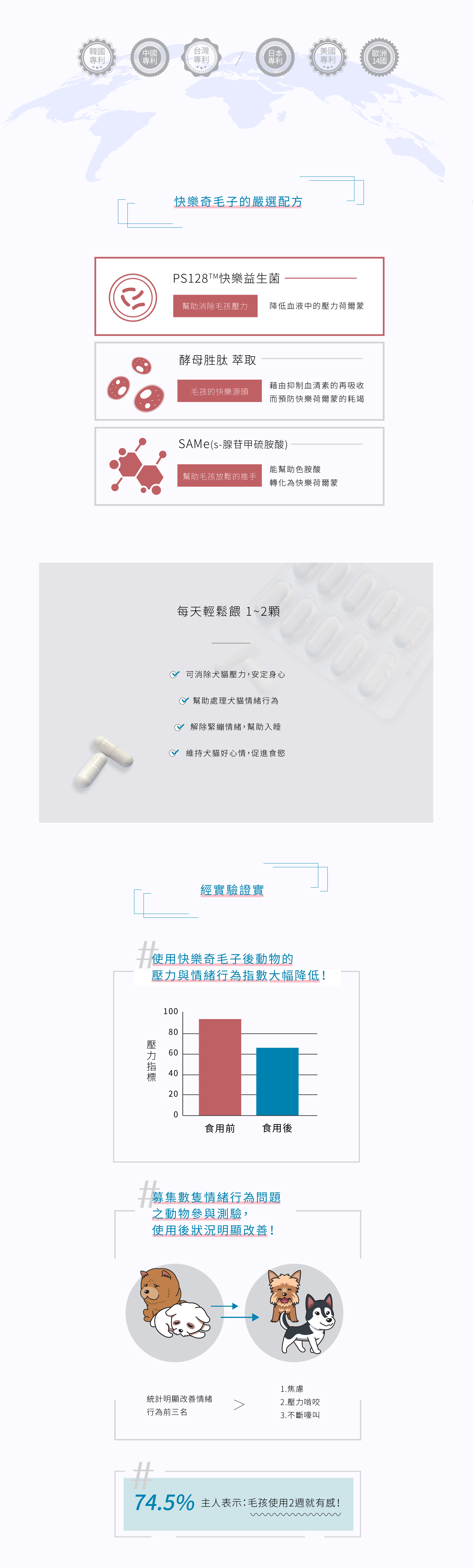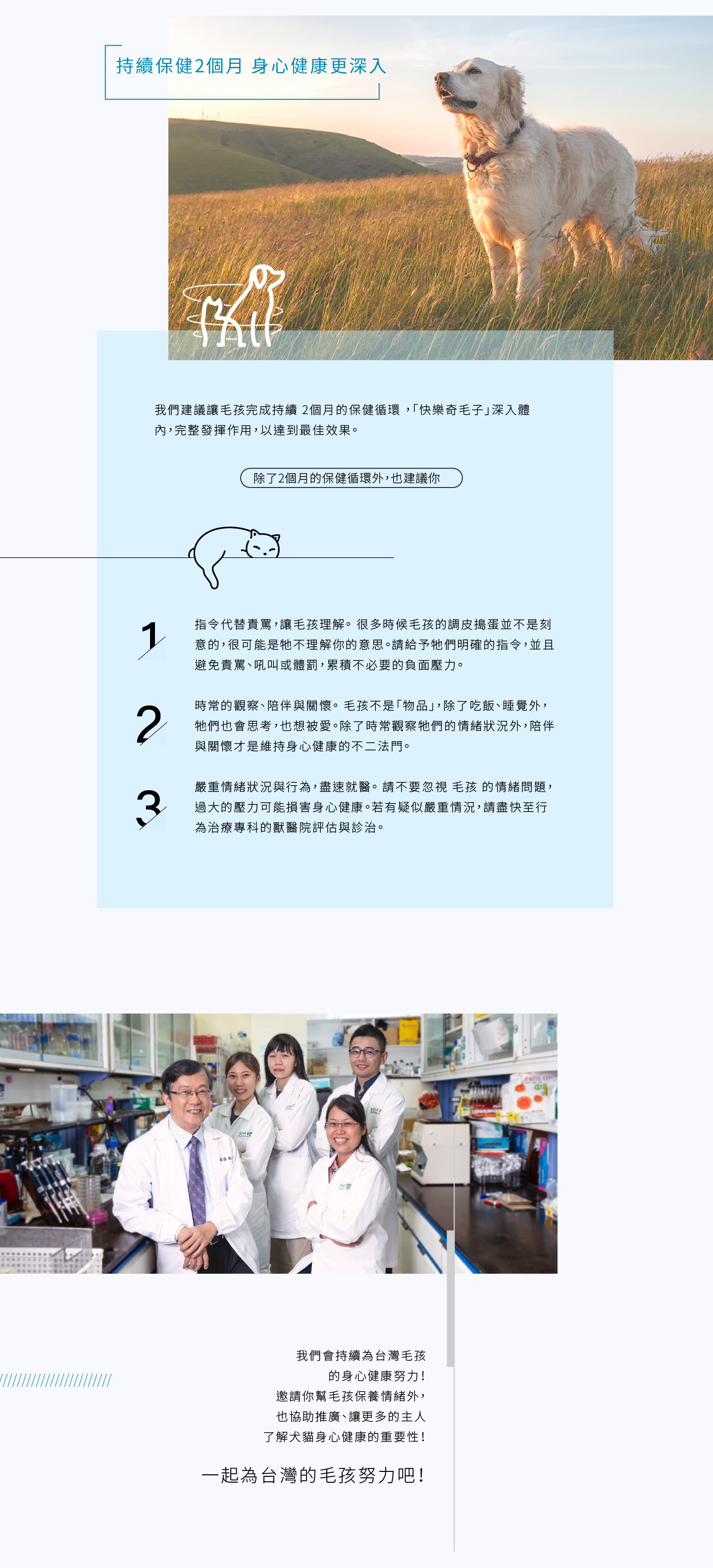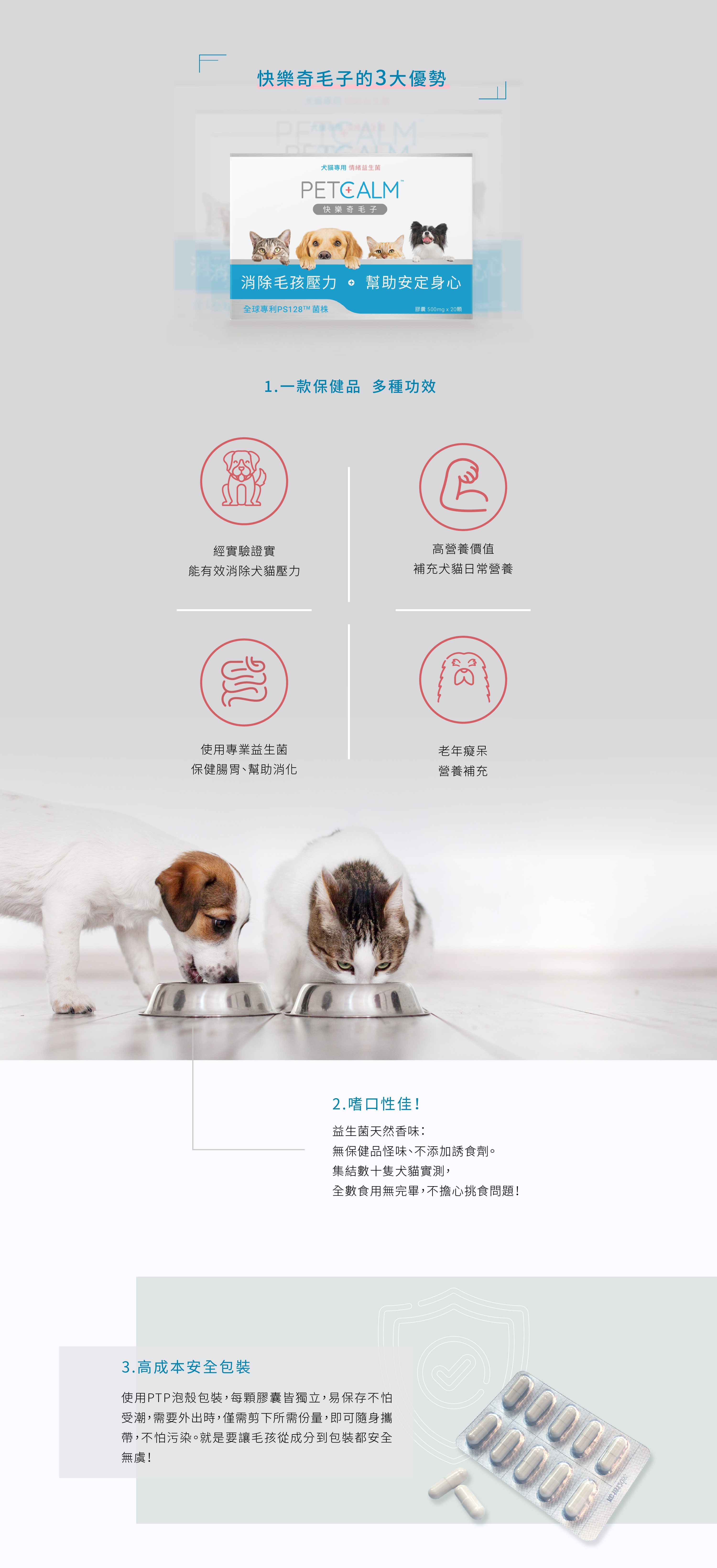 本計畫提倡並希望改變對台灣犬貓行為與情緒的重視,並與動物行為獸醫師、寵物專家長期合作研究,招募大量參與計畫的志願犬貓與主人,3年間效果與嗜口性不斷改良下,終於以PS128™快樂益生菌為基底,調配出適合犬貓的最佳配方: