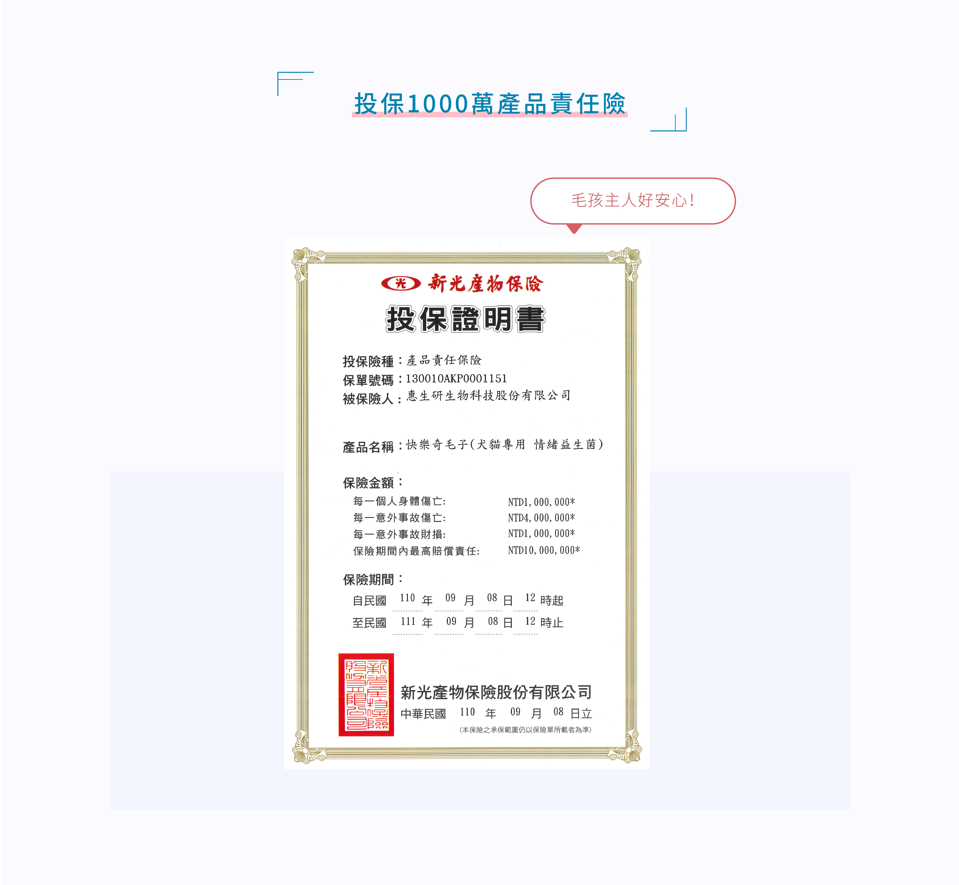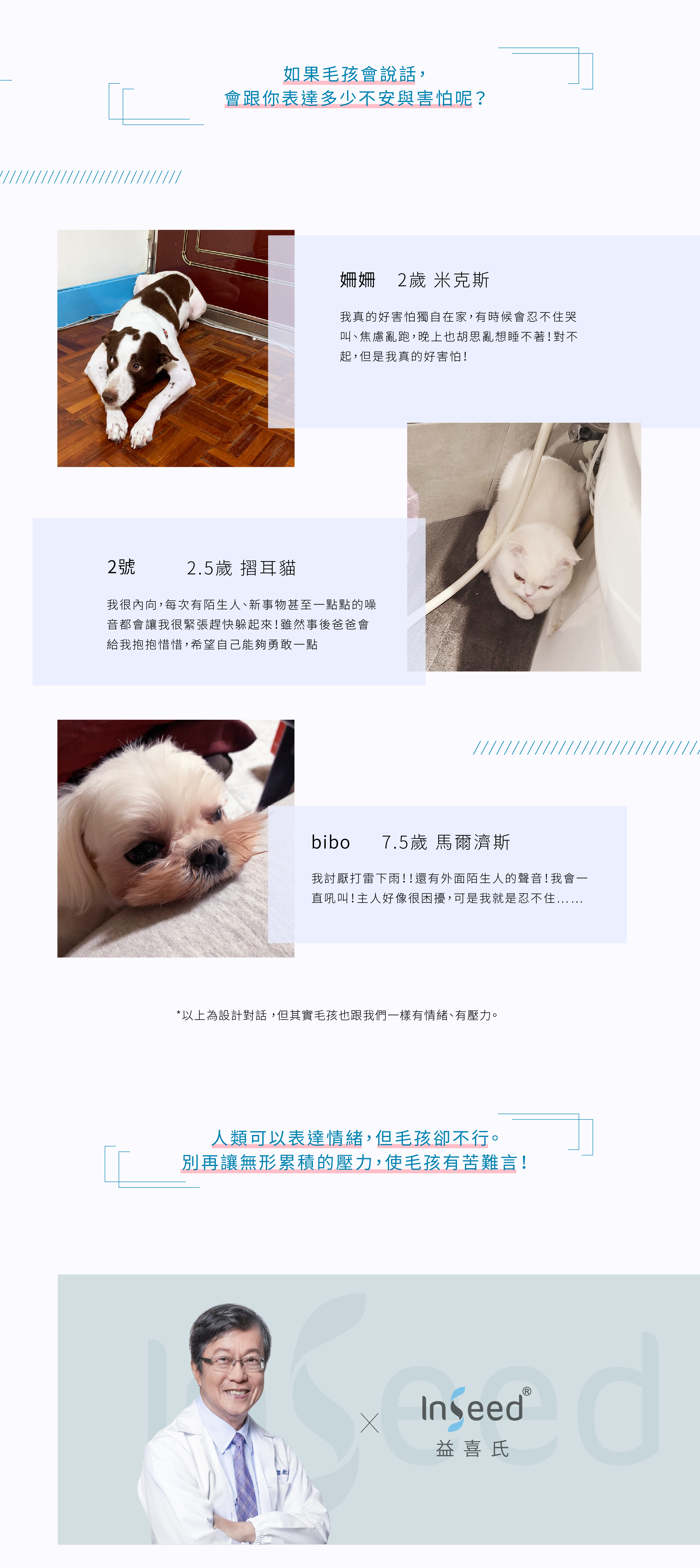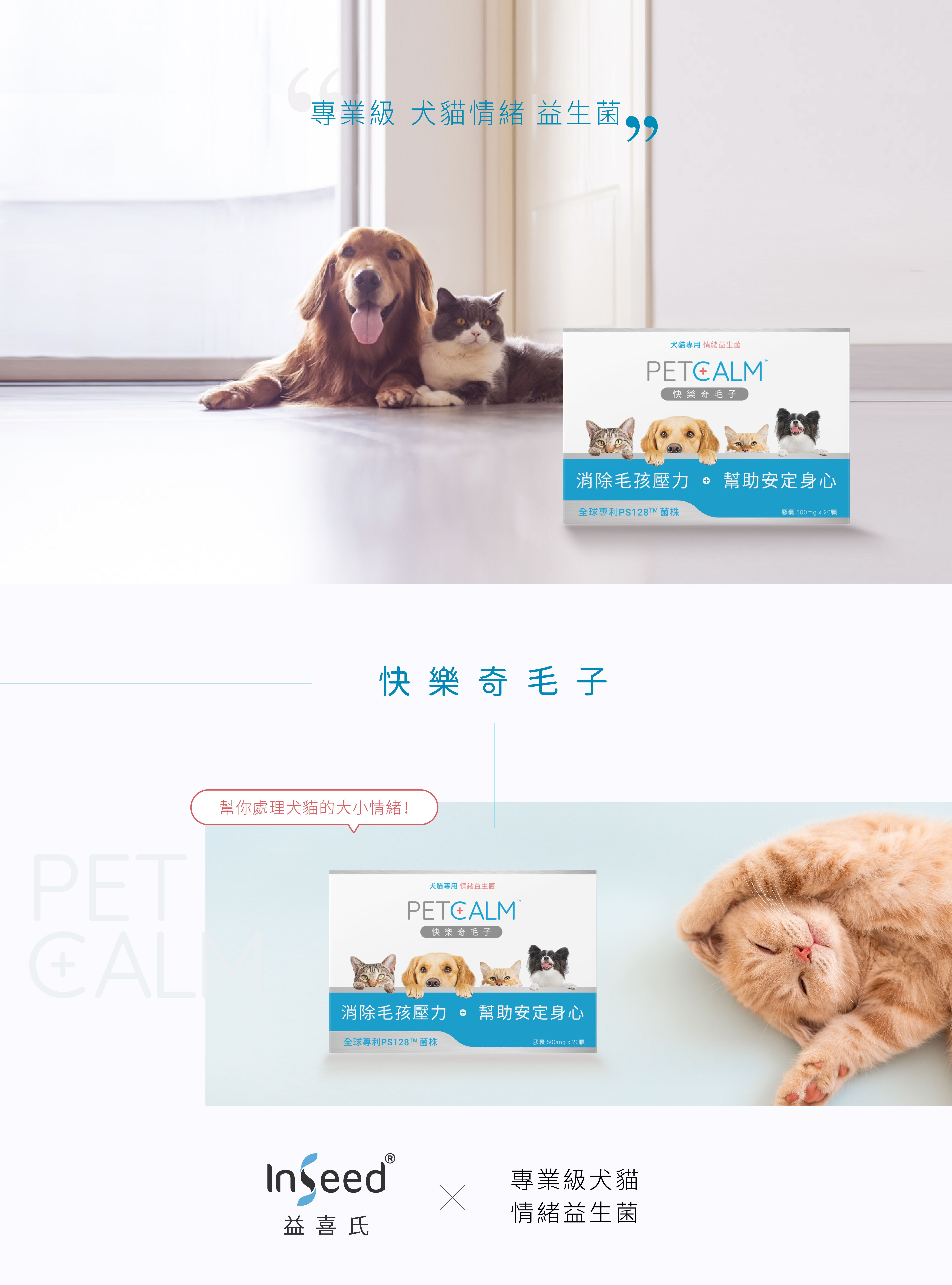 InSeed益喜氏生醫團隊 與 亞洲益生菌權威-蔡英傑教授聯合推出,經過動物醫院實驗,能有效幫助犬貓紓解情緒壓力、安定身心。並兼顧嗜口性、方便性、安全性與腸胃保健的專業級犬貓情緒益生菌。