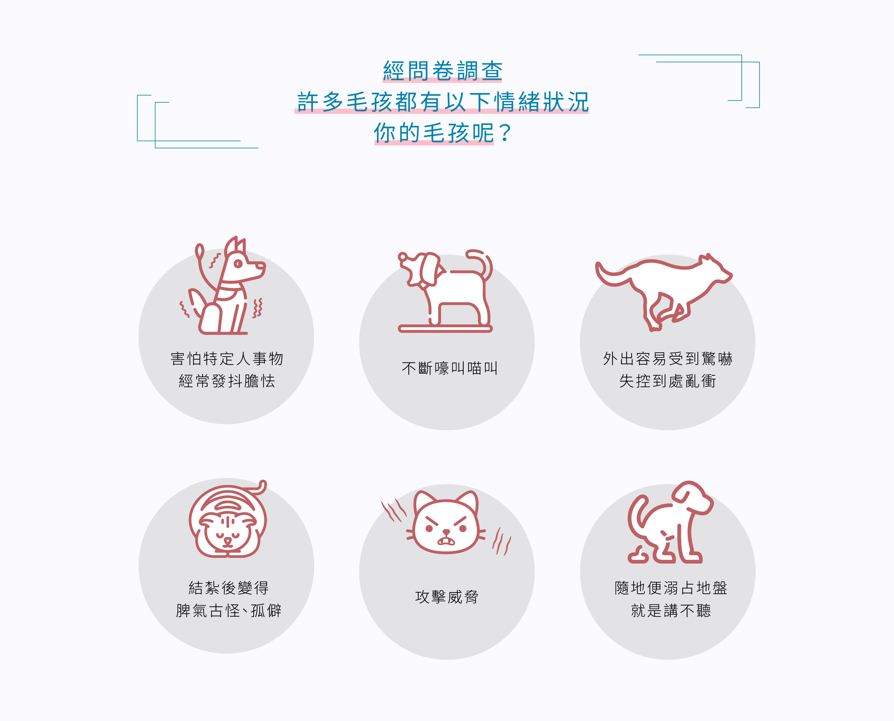 問卷調查結果,犬貓容易有的情緒壓力問題,如:不斷嚎叫/吠叫/喵叫、攻擊或威脅行為、失控暴衝、來回踱步、經常發抖、討厭陌生人、焦慮害怕、孤僻躲藏、結紮心理壓力、隨地便溺、排斥外出、騎乘行為、啃咬家具/身體、不吃東西/厭食/食慾低落…等。