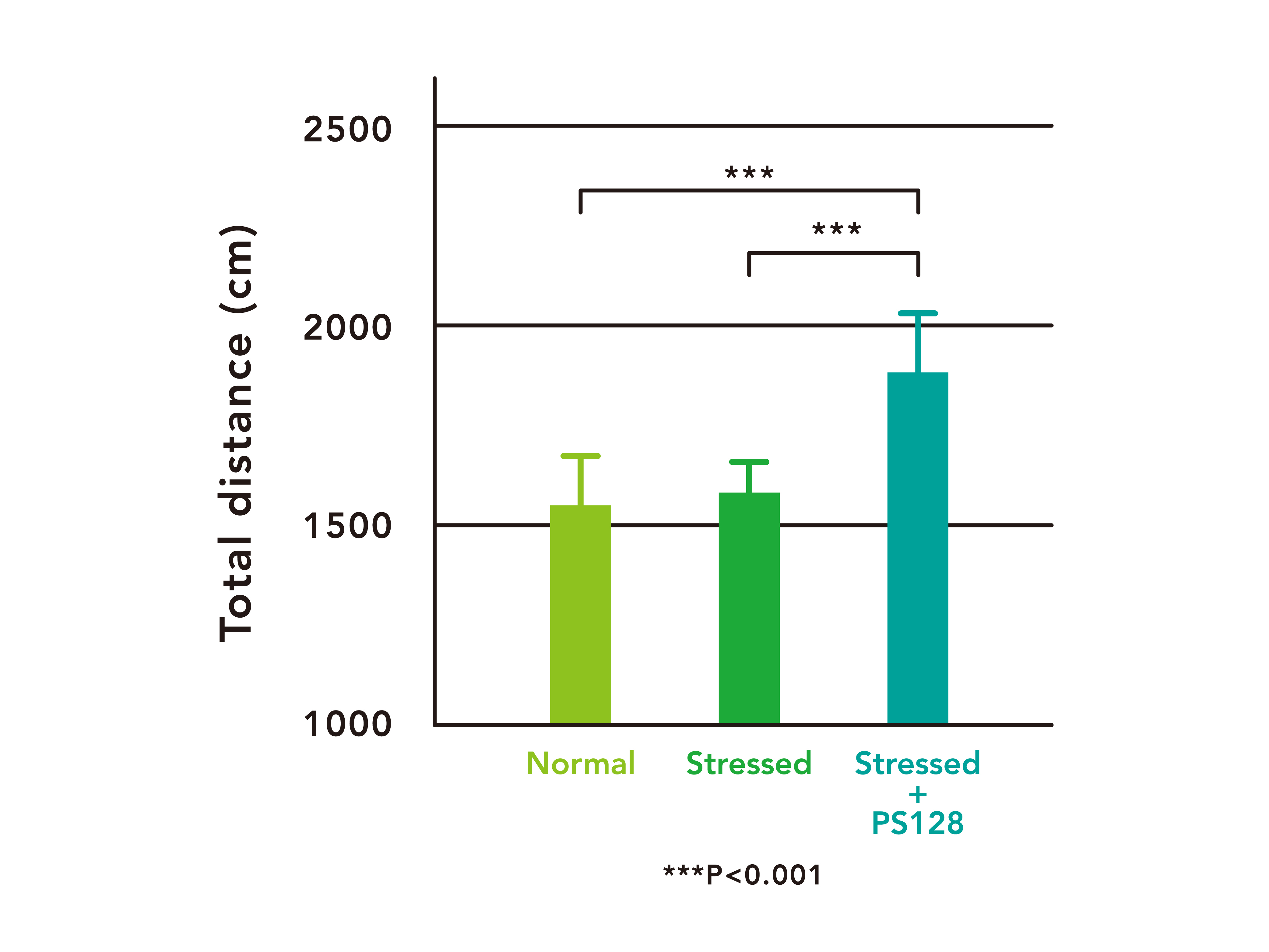 食用PS128™的焦慮小鼠(Stressed + PS128™)與其他兩組(Normal, Stressed)相比,進入場地中央區域的移動距離較長,顯示PS128™可減輕焦慮行為。