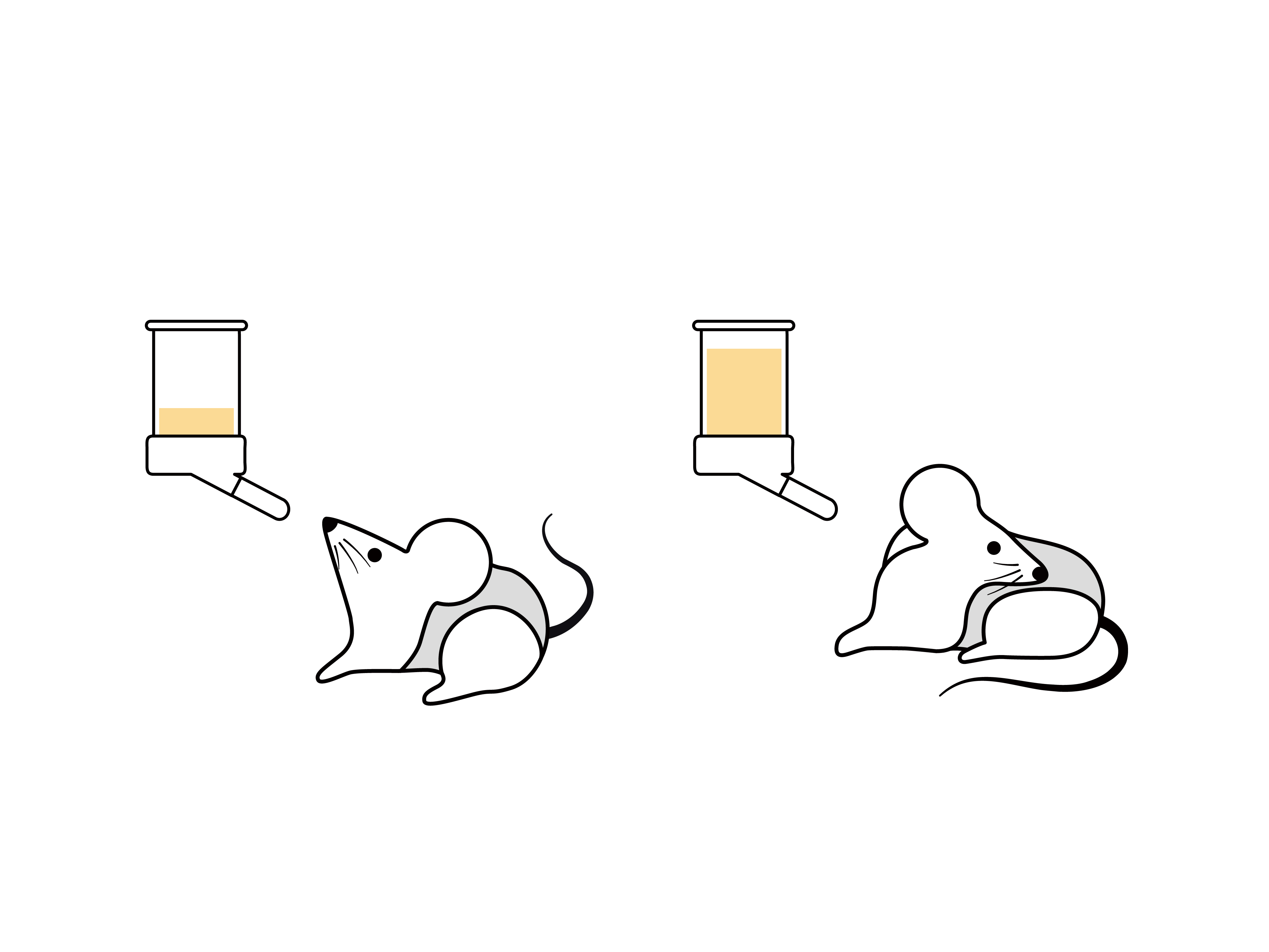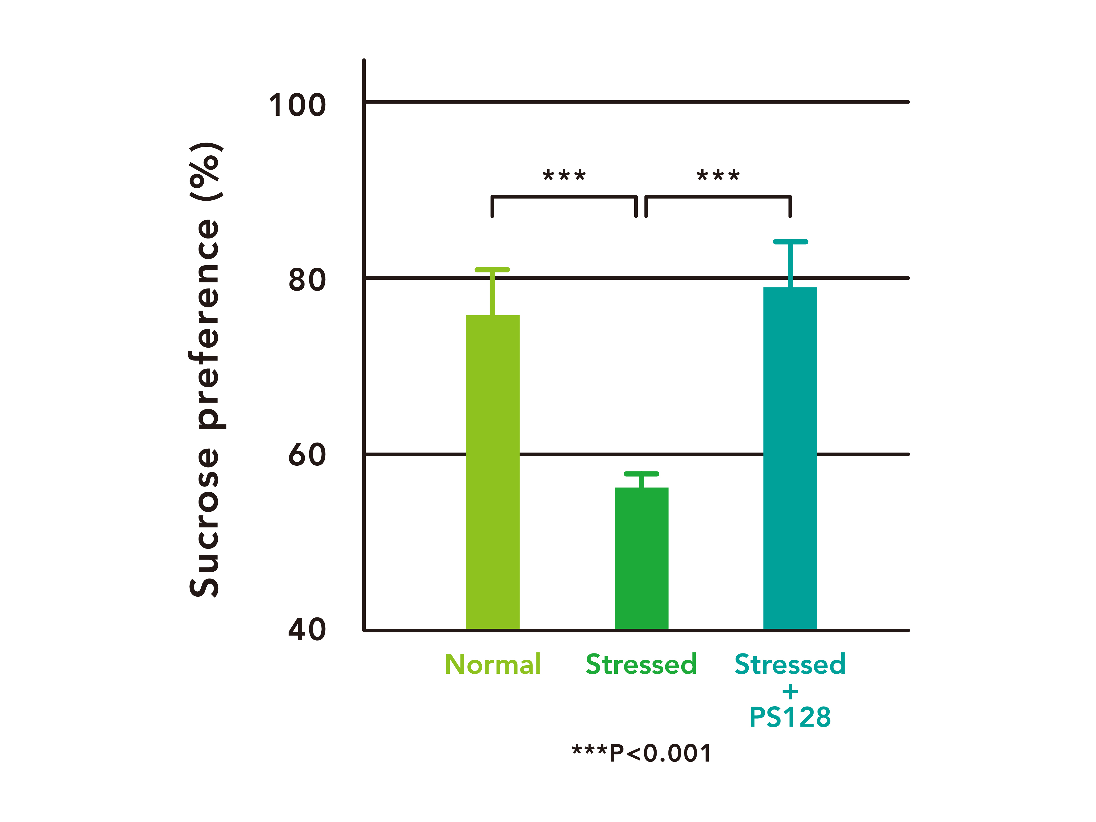 壓力引發的憂鬱行為之一是對於喜愛的事物會失去興趣,老鼠天性喜歡喝糖水,而憂鬰的老鼠則會失去這種喜好,因此糖水偏好實驗是用來測試動物的憂鬱表現。相較於正常小鼠(Normal),憂鬱小鼠(Stressed)對於糖水的興趣明顯降低。而食用PS128™之憂鬱小鼠(Stressed + PS128™)恢復了對於糖水的興趣。顯示PS128™可改善憂鬱現象。
