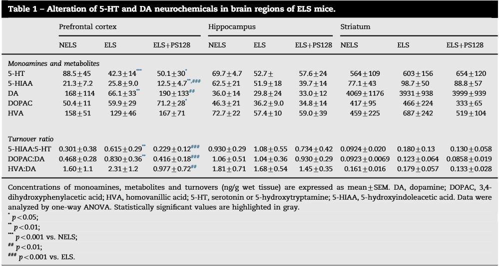 (表一:實驗鼠的血清素與多巴胺濃度比較表)NELS(正常鼠)ELS(憂鬰鼠)ELS+PS128™(餵食PS128™的憂鬰鼠)Prefrontal cortex(腦前額葉) Hippocampus(海馬迴) Striatum(紋狀體)