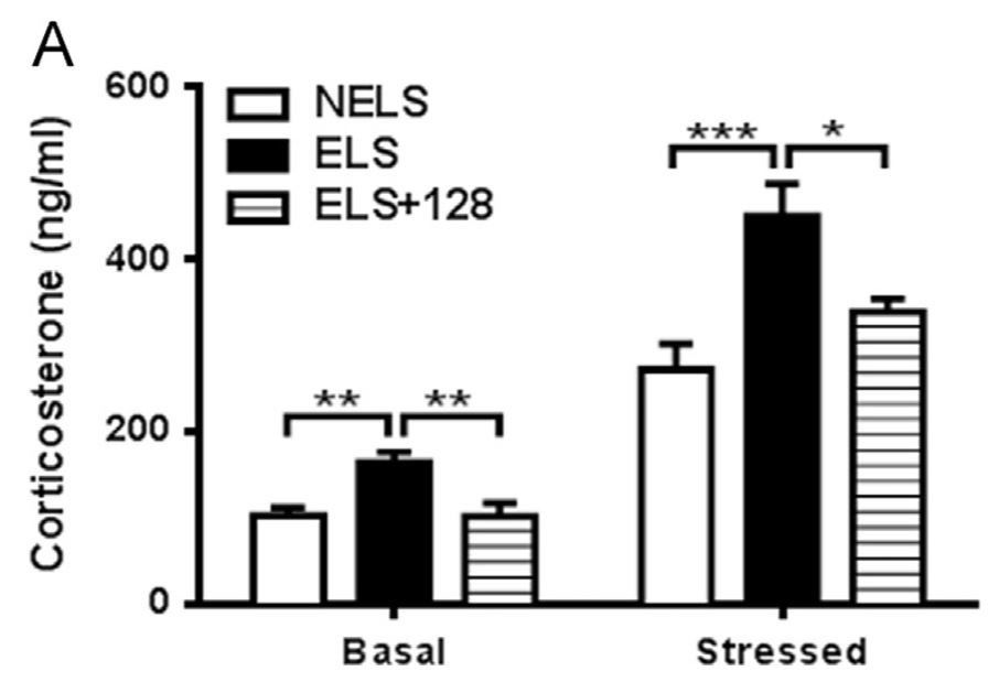 (圖4: 血清皮質酮)NELS(正常鼠)ELS(憂鬰鼠)ELS+PS128™(餵食PS128™的憂鬰鼠)Basal (基礎線:壓力試驗前) Stressed(壓力試驗後)