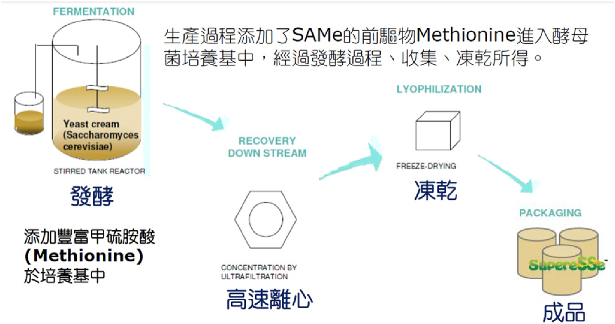 母菌細胞壁可以維持營養價值的穩定性,不易受周遭溫度影響(若從細胞中直接被萃取出來的SAM-e較不穩定),攝取經過乾燥酵母菌,其活性成分可在消化過程中有效吸收。此成分能幫助轉換血清素、代謝成褪黑激素,幫助放鬆、紓解緊張情緒。