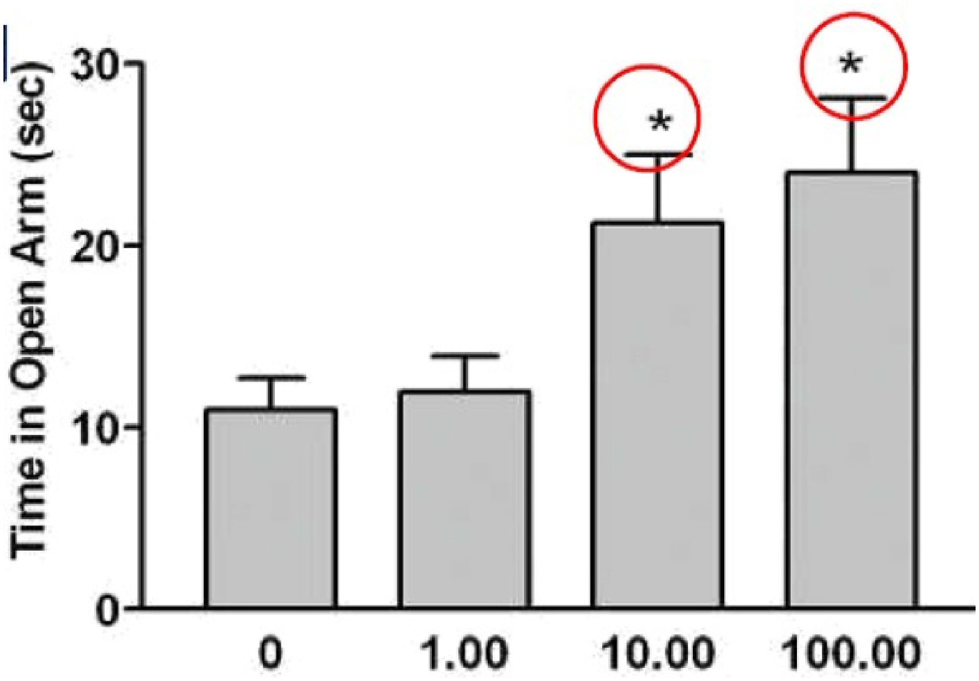 攝食酵母萃取物10、100mg/kg的大鼠待在高腳十字迷宮的時間顯著增加為控制組的2倍,